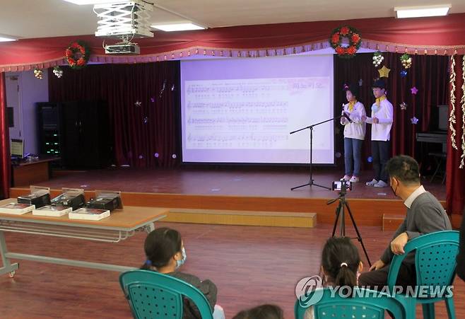 (카이로=연합뉴스) 노재현 특파원 = 10일(현지시간) 이집트 내 카이로한국학교(교장 김동섭)의 '꿈빛 학예회'에서 학생들이 리코더를 연주하고 있다. 학부모들은 신종 코로나바이러스 감염증(코로나19) 사태의 영향으로 학예회 현장에 오지 못하고 실시간 화상 프로그램을 통해 '언택트(비대면) 공연'을 관람했다. 아프리카 대륙의 유일한 한국학교인 카이로한국학교에서는 현재 어린이 26명이 배우고 있다. 2020.12.10