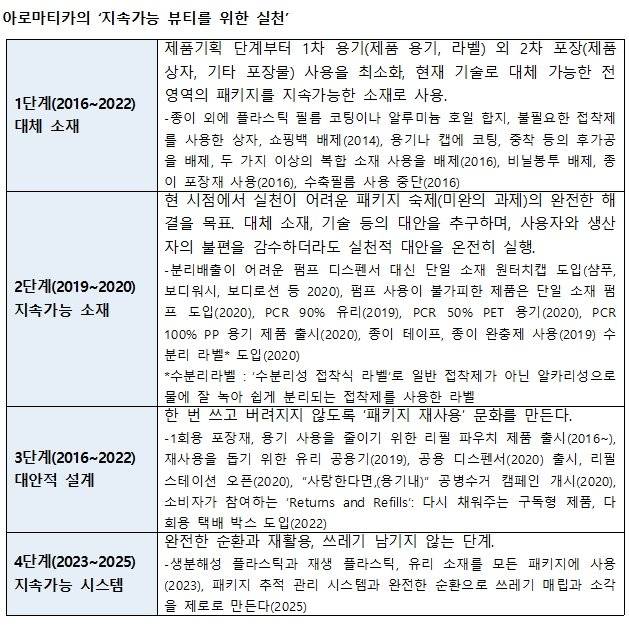 그러면서 아직은 100% 재활용 용기를 적용할 수 없는 현실을 감안해 이 회사가 제안하는 것이 리필이다. '지속가능한 뷰티'를 위해 자원과 공정을 최소화한 패키지를 사용하고(REDUCE), 사용한 패키지는 재활용할 수 있도록 돕고(REUSE), 재활용 가능한 소재 사용을 위해 노력하는(RECYCLE) 등 3R을 실천 중이다. 2023년 생분해성 플라스틱과 재생 플라스틱, 유리 소재를 전 패키지에 사용하고 2025년 패키지 추적 관리 시스템을 통한 완전한 순환으로 쓰레기의 매립과 소각을 제로로 만들 것을 목표로 하고 있지만 그 전까지는 한번 쓰고 버려지지 않도록 '패키지 재사용' 문화를 만드는 것을 최우선의 과제로 여기고 있다.