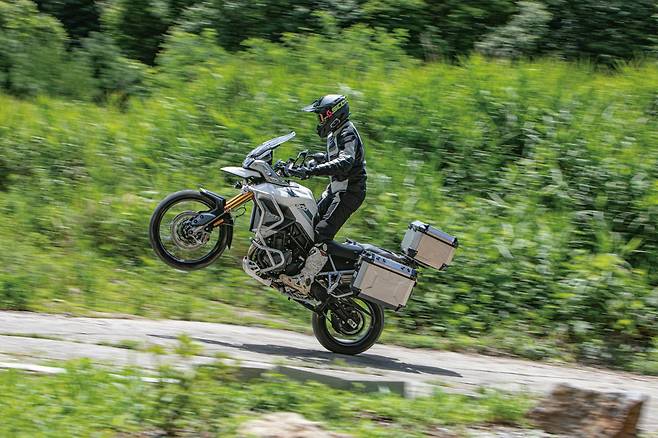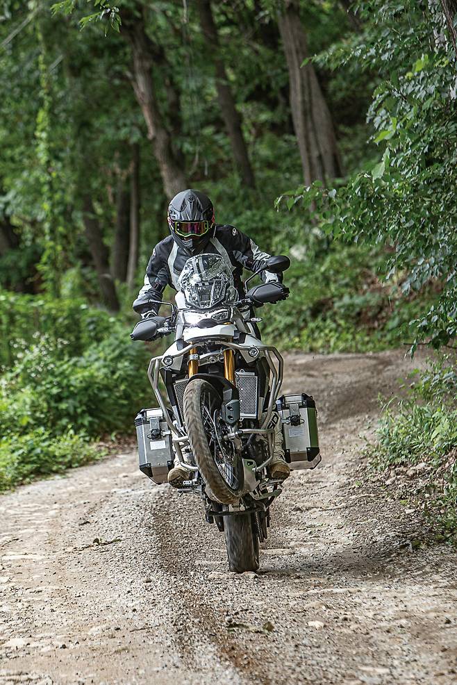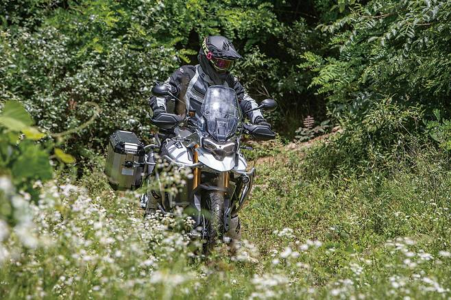 타이거 900 시리즈는 랠리 프로를 위해 개발되었다고 봐도 과언이 아니다. T-플레인 트리플 엔진 형식 자체가 오프로드 주행 중 노면 마찰력을 쉽게 인지할 수 있도록 개발되었기 때문이다. 부드러우면서도 앙칼진 엔진은 스로틀을 조작할 때마다 타이어가 흙을 내뱉는 것을 느낄 수있다. 출력은 과거 모델보다 상승했음에도 스로틀 조작의 부담이 줄어들어 과감한 라이딩이 가능하다. 가속 중 프런트가 들리더라도 스로틀 조작에 대한 움직임이 또렷하여 부담이 없다. 전방에 장착된 21인치 와이어 스포크 휠은 쇼와 45mm 도립식 포크와 어우러져 노면 추종성이 뛰어나고 장애물을 만났을 때 가볍게 처리한다. 전후 240mm, 230mm 의 긴 스트로크를 확보하고 있어 예상치 못한 노면에도 쉽게 대응하는 느낌이다. 시승 차량의 타이어가 온로드 성향이 강했음에도 오프로드를 넘나들 수 있었던 가장 큰 이유다. 특히 스키드 플레이트를 장착한 상태에서도 지상고가 충분히 확보되어 웬만한 코스에서는 차량 하부가 걸릴 걱정은 하지 않아도 좋을 정도다. GT 모델과 비교했을 때 풋 패그가 더 낮고 뒤에 위치하기 때문에 리어에 하중을 치중하기 좋고 무게 중심을 낮출 수 있어 안정적이다. 스티어링 각도가 공격적이고 프런트에 무게가 덜 실리는만큼 핸들링이 가벼워 재원 상의 건조중량인 201kg보다 가볍게 느껴진다.