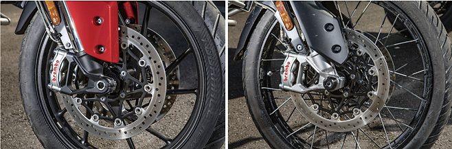 전륜에는 100mm 폭의 19인치를, 후륜에는 150mm 폭의 17인치 휠을 조합했다. 배기량에 딱 맞는 과장되지 않은 폭의 타이어가 경쾌한 핸들링을 만든다. 지난봄, 아프리카 모로코에서 타이거900GT를 탔을 때는 그 하체에 착착 붙는 날렵한 코너링 성능에 감탄했다. 하지만 어쩐지 오늘은 그보다는 좀 둔하게 느껴진다. 특히 중심에서 바이크를 기울이기 시작할 때 한박자 늦게 따라오는 느낌이 살짝 거슬렸다. 그 원인은 다름 아닌 거대한 박스들, 그중에서도 탑케이스의 영향이 컸다. 탑케이스 하나만 떼어내도 본연의 날카로운 코너링 감각이 살아난다. 가볍게 샥샥 방향을 바꿔나가는 느낌이 스포츠 바이크 못지않다. 사이드 케이스가 전체 무게는 더 나가지만 무게중심이 잘 잡혀서인지 의외로 코너링에는 영향이 적었다. 만약 가벼운 짐만 챙겨서 와인딩 로드를 포함하는 투어를 간다면 탑케이스는 집에 두고 가는 것을 추천한다. 주행의 재미를 확실히 더해 줄 것이다. 이번 테스트에서 두 대를 번갈아가며 비교하니 랠리와 GT의 미묘한 차이점이 더욱 도드라진다. 특히 브레이크 세팅이 흥미로웠다. 같은 디스크와 캘리퍼를 장착했지만 GT쪽이 훨씬 잘 듣는다. 아마도 둘의 휠 사이즈가 다른 것과 서스펜션 세팅의 영향도 미쳤겠지만 이 정도 차이라면 세팅의 차이도 있는 것으로 보인다. 브렘보 스티레마 캘리퍼의 성능을 제대로 활용하는 건 역시 GT쪽이다. 레버를 터치하는 순간부터 바이크가 멈출 때까지 탄탄하고 확실한 제동성능을 보여준다. 랠리는 GT보다 초기 응답이 무르고 제동력 상승이 완만하다. 오프로드 컨트롤을 고려한 세팅이다. 같은 파츠를 쓰더라도 각 모델의 성격에 맞게 설정된다. 또한 포지션에서도 차이가 났다. 차체를 기준으로 보면 GT의 풋패그는 살짝 앞쪽 위로 올라와 있고 핸들바는 뒤로 살짝 옮겨져 있다. 이게 실제로 풋패그를 밟고 타는 라이더 입장에서 보면 시트는 뒤쪽 아래로 옮겨지고 핸들바 위치는 몸에 가까워진다. GT를 탔을 때 더 편하고 바이크가 작아진 것처럼 느껴지는 이유다.