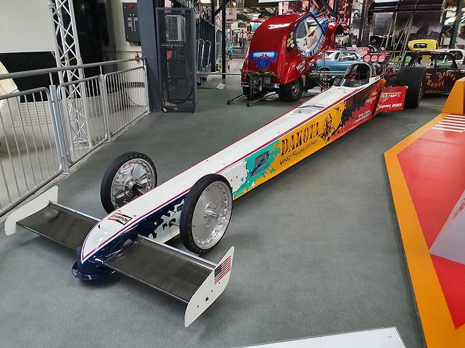 독일을 포함한 유럽인들에게 진스하임 자동차 박물관의 첫인상은 꽤나 이국적입니다. 이유는 1전시관에 들어서면 바로 확인이 가능한데요. 입구를 통과하자마자 각종 드래그레이스용 자동차들과 화려한 색상의 미국산 클래식카들이 넓은 공간을 가득 채우고 있는 걸 볼 수 있습니다.