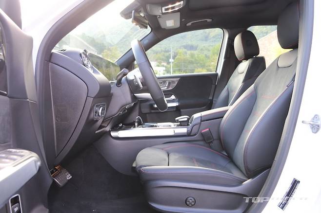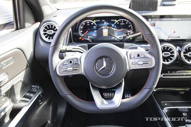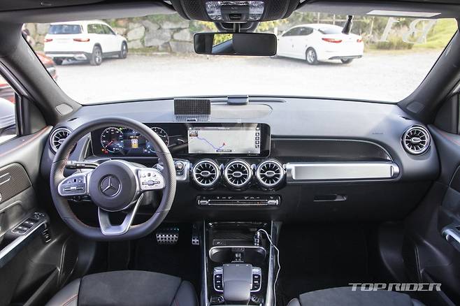 디스플레에이는 터치 기능과 음성 인식 컨트롤을 지원하는 MBUX 인포테인먼트 시스템이 탑재됐다. 센터페시아 송풍구와 실내 곳곳에 알루미늄 느낌의 튜브형 요소는 GLB만의 포인트다. D컷 다기능 스포츠 스티어링 휠은 나파 가죽으로 마감됐다.