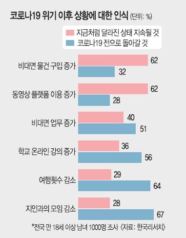 한국리서치가 지난 5월 초 발표한 조사 결과를 보면 응답자의 60% 이상이 코로나19 시대 이후에도 비대면 물건 구입과 동영상 플랫폼 이용 증가 등이 지속될 것으로 봤다. 비대면 물건 구입이 계속 늘어날 것으로 보는 응답자는 10, 20대는 물론 60대 이상까지 전 연령대에서 60%를 넘겼다. KB금융지주 경영연구소 김태환 연구위원은 “상대적으로 오프라인 매장에 대한 선호가 강했던 계층도 온라인으로 이동하기 시작했다”며 “가능한 한 사람들과의 접촉을 최소화하려는 거리두기 소비가 확산되면서 제품 판매와 서비스 제공 방식에도 변화가 있을 것”이라고 예상했다.