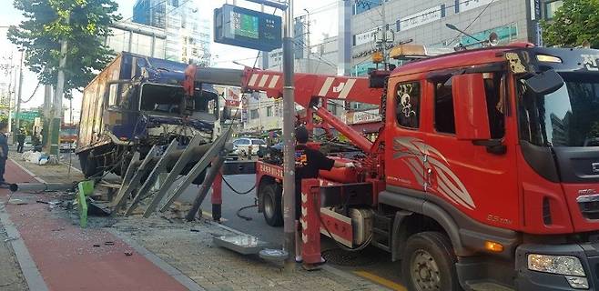 (서울=연합뉴스) 23일 오후 서울 강서구 화곡역 인근에서 5t짜리 이삿짐 운반 트럭이 인도에 있는 버스 정류장과 전봇대를 들이받았다. 사고 충격으로 전봇대가 인도 방향으로 쓰러지고 버스 정류장은 형체를 알 수 없게 무너져 내렸다. 2020.8.23 [서울 강서소방서 제공. 재판매 및 DB금지]