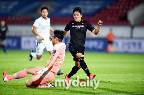 [마이데일리 = 성남 곽경훈 기자] 수원 삼성 노동건 골키퍼가 29일 오후 경기도 성남시 탄천종합운동장에서 진행된 '2020 하나은행 FA컵 8강전' 수원 삼성-성남FC의 경기에서 성남 나상호에 앞서 볼을 걷어내고 잇다.- ⓒ마이데일리(www.mydaily.co.kr). 무단전재&재배포 금지 -