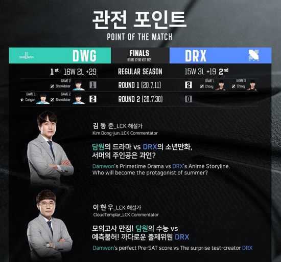 4일 LCK 공식 인스타그램에는 "[Point of the #LCK Summer FINAL]"이라는 글과 함께 담원 대 DRX의 해설가들의 결승전 관전 포인트가 올라왔다.