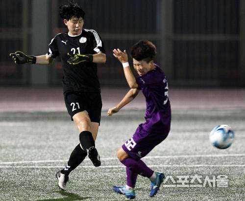 세한대 권해인 골키퍼가 20일 경남 창녕공설운동장에서 진행된 ‘제28회 여왕기 전국여자축구대회’에서 문경대를 맞아 이지현의 슛에 앞서 공을 걷어내고있다. 2020.08.20. 창녕 | 김도훈기자 dica@sportsseoul.com