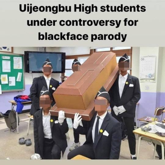 공개된 사진에는 의정부 고등학교 학생들이 졸업사진 콘셉트로 '관짝소년단'을 흉내낸 모습이 담겨있다. 의정부 고등학교는 매년 화제가 된 인물과 이슈를 패러디한 졸업사진으로 화제를 모으는데, 이 학생들은 '관짝소년단'을 패러디해 얼굴을 검게 칠하고 흑인 분장을 한 채 관을 들고 졸업 사진을 찍었다.
