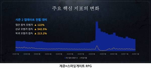 우선, 2020년 1월부터 12월 초까지의 주간 접속자 수 그래프를 공개했다. 미미한 하강 곡선을 그리던 그래프는 시즌2를 업데이트한 8월을 기준으로 한차례 높게 치솟았으며, 이후 안정권을 되찾는 모습을 보였다. 특히, 접속자 수가 폭발적으로 늘어난 8월에는 7월 대비 일간 접속자가 122% 증가했으며, 신규 이용자 또한 542.5%, 복귀 이용자 213.2%의 증가율을 기록하기도 했다.