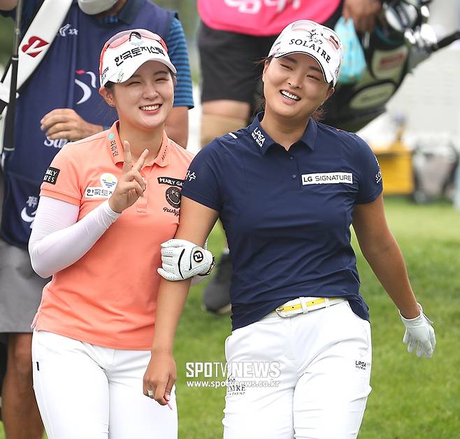 [스포티비뉴스=제주, 곽혜미 기자] KLPGA 제주삼다수 마스터스(총상금 8억 원, 우승상금 1억6000만 원)' 2라운드가 31일 제주도 세인트포 골프&리조트(파72 / 6500야드)에서 열렸다. 박현경이 티샷을 마친 후 고진영과 홀 이동을 하며 인사를 하자고 팔짱을 끼고 있다.