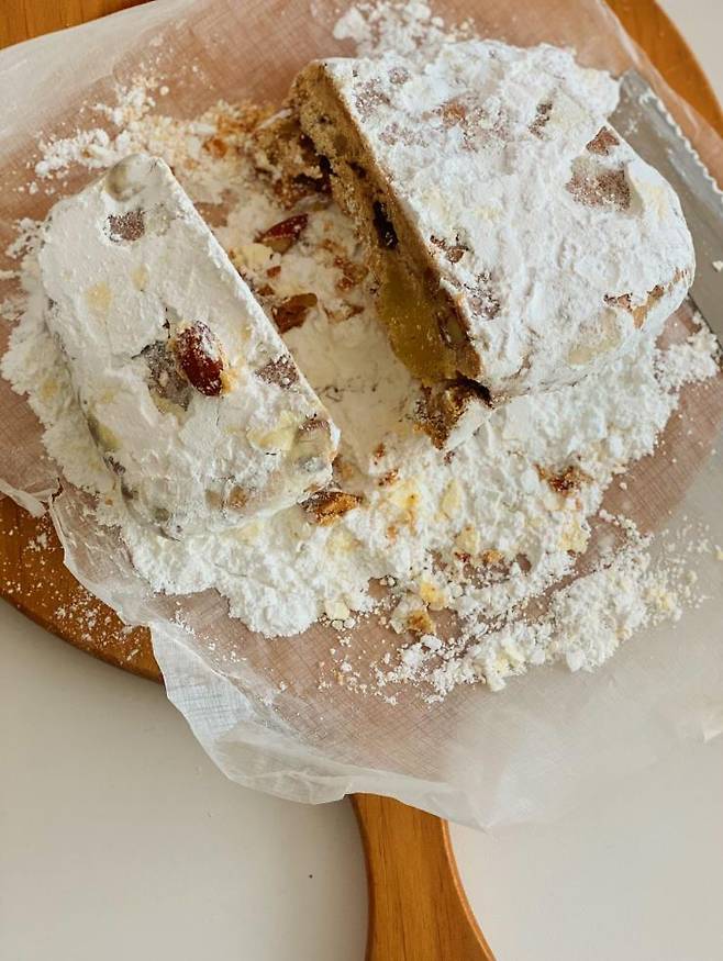 기본에 충실한 빵을 파는 '오월의종'. 아침 일찍 가지 않으면 빵이 금세 품절되는 곳이죠. 오월의 종 슈톨렌은 다른 곳보다 경도가 단단해서, 마치 쿠키를 먹는 듯한 느낌도 듭니다. 이 때문에 호불호가 나뉘기도 하지만, 비스코티 같은 쿠키를 좋아하는 사람이라면 적극 추천해요. 따뜻한 커피를 마실 때 곁들이면 딱입니다. 럼주에 일 년 동안 숙성시킨 과일, 아몬드가 어우러진 맛은 슈톨렌의 기본을 모두 갖췄다고 생각해요. 예약 못 하신 분들도 현장 구매 가능해요.