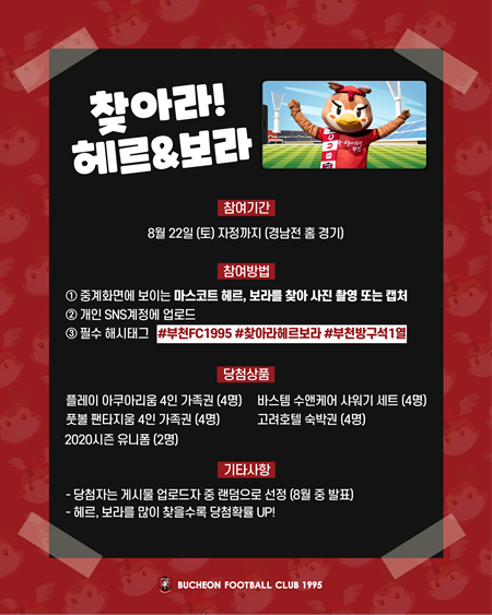 경기도 지역에 사회적 거리두기가 2단계로 격상하며 부천은 무관중으로 경기를 진행하게 됐다. 팬들은 이에 따라 자택에서 TV 또는 인터넷 중계로 마스코트, ‘헤르’와 ‘보라’를 찾아 경기 당일(22일) 자정까지 개인 소셜 미디어에 업로드 하면 된다. ‘#부천FC1995’, ‘#찾아라헤르보라’, ‘#부천방구석1열’ 등 해시태그 키워드도 추가해야 한다.