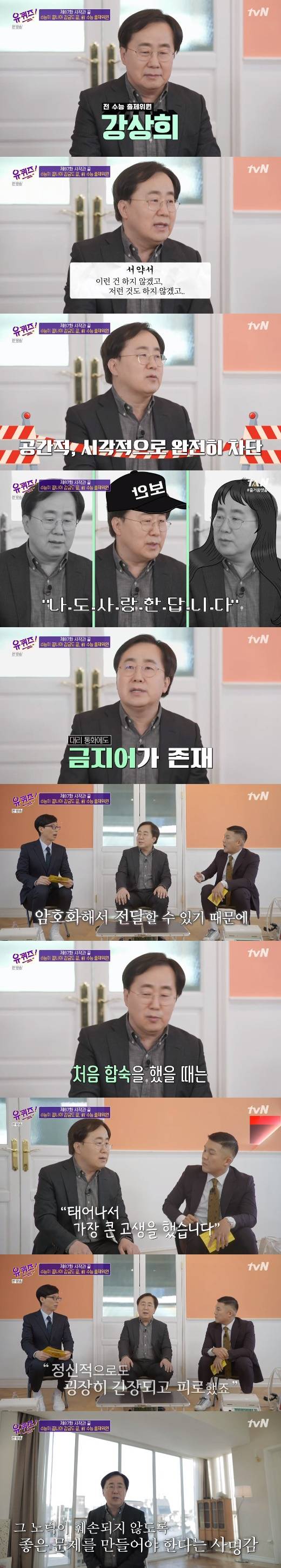 강상희 대표는 "문제 출제와 관련된 해당 전공 대학교수, 또는 재직 중인 교사분들이 참여하는데 당시 제가 국어국문학과 교수로 있을 때 제안을 받았다. 담당 기관으로부터 연락이 오면 각종 서약을 한다. 3년 연속 출제, 수험생 자녀가 있으면 안 된다. 자세한 과정은 철저하게 비밀이다"라고 이야기를 꺼냈다.