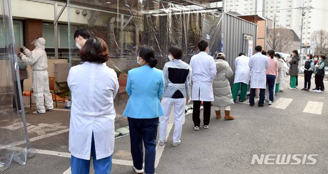 [광주=뉴시스] 류형근 기자 = 21일 오전 광주 남구 광주기독병원 서5병동에서 신종 코로나바이러스 감염증(코로나19) 확진자가 발생해 의료진 등 종사자 전수검사가 실시되고 있다. 2020.12.21.