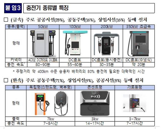 환경부는 주로 고속도로 휴게소, 국도변 주유소, 도심 내 주유소ㆍ충전소 등 보다 접근성이 높은 이동거점에 급속충전기를 약 1600기를 구축키로 했다. 완속충전기는 주로 장시간 머무르는 주거지, 직장 등을 중심으로 8000기 이상 구축해 체감 충전 편의성을 높인다는 방침이다.