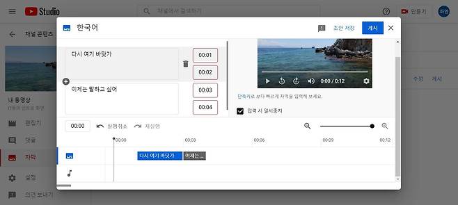 유튜브 스튜디오에서 자막 기능을 이용하면 영상에 바로 간단한 기본 자막을 넣을 수 있다. 자막을 입력한 다음 원하는 길이와 위치로 자막 클립을 조정해서 영상에 자막을 추가하는 방법을 공유한다.