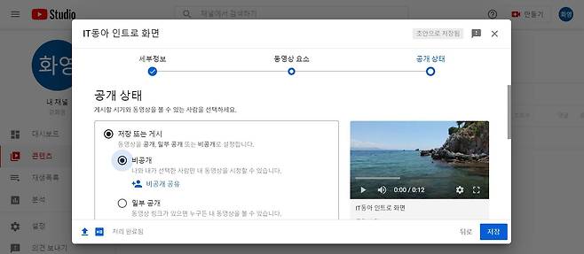 세부정보 창에 영상 제목(필수 항목)과 설명을 입력한다. 시청자층 항목에서 업로드하려는 동영상 시청자층을 선택한다. 예제에서는 '아니요, 아동용이 아닙니다'를 선택하고 '옵션 더보기'를 누른다. 유료 프로모션, 태그, 언어/자막 가운데 원하는 설정을 한다. '동영상 요소' 글자를 눌러 다음 화면이 뜨면 '다음' 버튼을 눌러 기본 설정을 적용한다. 공개 상태 항목에서 공개 정도를 선택한다. 예제는 영상 편집 전 단계이므로 자신만 볼 수 있도록 '비공개' 설정을 한 다음 '저장' 버튼을 선택한다.