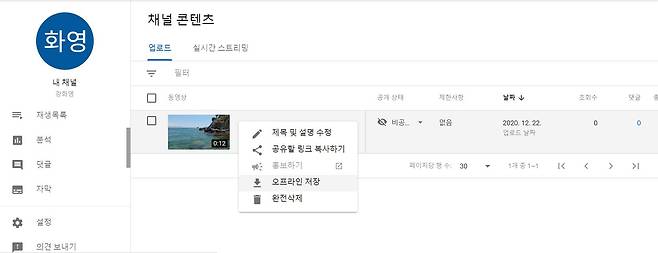 '채널 콘텐츠' 버튼을 눌러 유튜브 스튜디오 화면으로 이동해 영상을 확인한다. 자막을 넣은 영상 '옵션' 버튼을 눌러서 '오프라인 저장'을 선택해 내 PC에 저장할 수 있다.