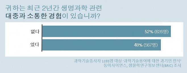 하지만 현실과의 괴리는 컸다. 최근 2년간 생명과학 관련 내용으로 대중과 소통한 경험이 있는 과학자들은 절반에도 미치지 못하는 것으로 조사됐다.