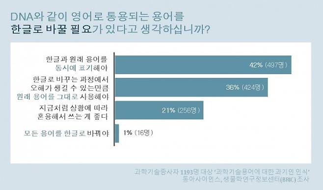 이들에게 생명과학 용어 표기에 대한 의견을 묻자 500명에 가까운 참가자가 한글과 원래 용어를 동시에 표기할 필요가 있다고 답했다. 가령 'DNA'처럼 이미 영어로 널리 사용되고 있는 용어의 경우 전체의 42%(497명)가 한글과 영어를 동시에 표기하는 게 적절하다고 답했다. 한 응답자는 "용어 변경은 함부로 하면 안 된다"며 "오히려 전문가와 대중의 소통에 불필요한 혼란만 가중시킨다"고 말했다.