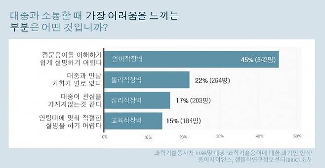 동아사이언스와 국어문화원연합회가 포스텍 생물학연구정보센터(BRIC 브릭)와 함께 생명과학자·의과학자 1193명을 대상으로 '과학기술용어에 대한 과기인 인식조사' 설문조사를 진행한 결과 생명과학 분야 과학자들이 대중과 소통할 때 가장 큰 어려움을 느끼는 이유는 과학자와 대중 사이의 언어적 장벽인 것으로 드러났다. 전문 용어를 대중에게 이해하기 쉽게 설명하기 어렵다는 것이다.