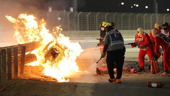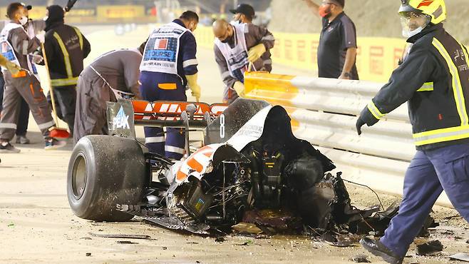 이후 F1 주최 측인 FIA(국제자동차연맹)는 곧바로 경기를 중단시키고 사고를 수습했다. 강력한 화염에 휩싸인 경주차는 이후 앙상한 몰골을 드러내며 사고 당시 충격의 상황을 고스란히 보여줬다. 그로장은 충돌 당시 53G의 중력 가속도(약 3.8톤)의 충격을 받았지만 경주차의 안전 설계 덕분에 무사히 현장을 빠져 나올 수 있었다.