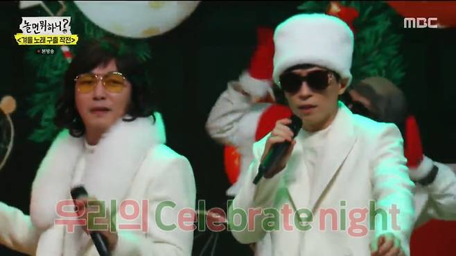 이어 탁재훈과 유재석이 컨츄리꼬꼬 '해피 크리스마스(Happy Chirstmas)' 무대로 분위기를 달궜다. 두 사람은 환상 케미로 즐거움을 선사했다. 인중에 땀을 흘릴 만큼 열심히 춤을 춘 가발 쓴 탁재훈은 "방송 후 욕 먹었다. 욕 안 먹는다고 했지 않았느냐"며 불만을 들어냈다. 그러자 유재석은 "형 때문에 우리 프로그램도 조금 욕 먹는다. 퉁치자"고 다독였다. 연습 당시부터 척척 잘 맞는 호흡을 자랑하자 유재석은 감탄했고, 탁재훈은 "아직도 걔랑만 잘 맞는 줄 알았다"고 말해 폭소케했다.
