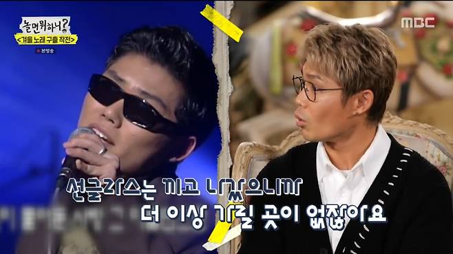 유재석은 "지금은 실력으로 평가받는 시대잖냐. 그런 부분을 김범수 씨가 이끈 거"라고 토닥였다. 데프콘은 사극부터 영화까지 다양한 장르에서 OST로 사랑받는 김범수에 극찬을 보냈다. 유재석은 "너는 '보고 싶다'를 무조건 불러야 한다. 아니면 '나타나'는 어떻냐"면서 "네가 안식년 마치고 나타나는 거니까"라고 의미를 부여했다. 김범수는 '끝사랑' '나타나' '와르르'를 연이어 라이브로 선보이며 '국보급 보컬'의 위엄을 증명했다.