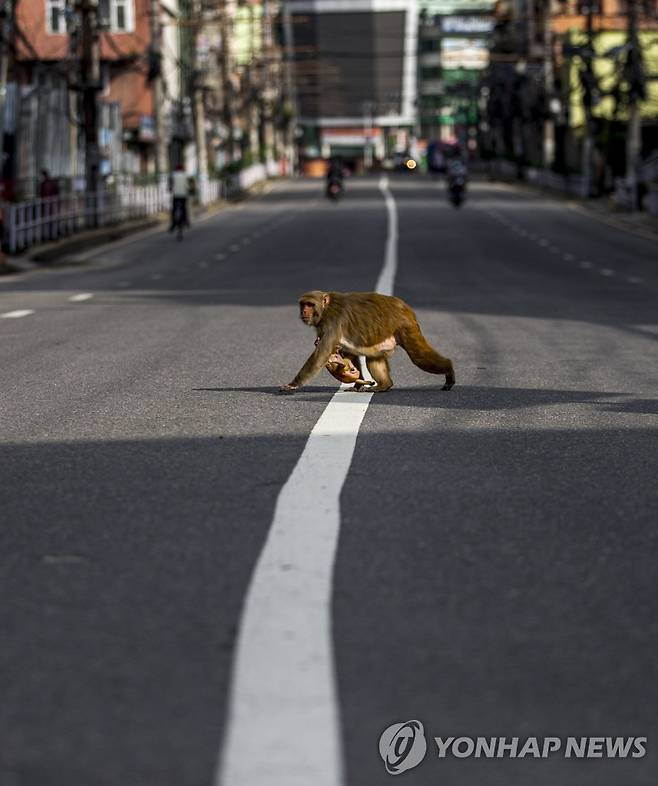 (카트만두 EPA=연합뉴스) 26일(현지시간) 신종 코로나바이러스 감염증(코로나19) 여파로 봉쇄된 네팔 카트만두에서 원숭이 한 마리가 길을 건너고 있다.