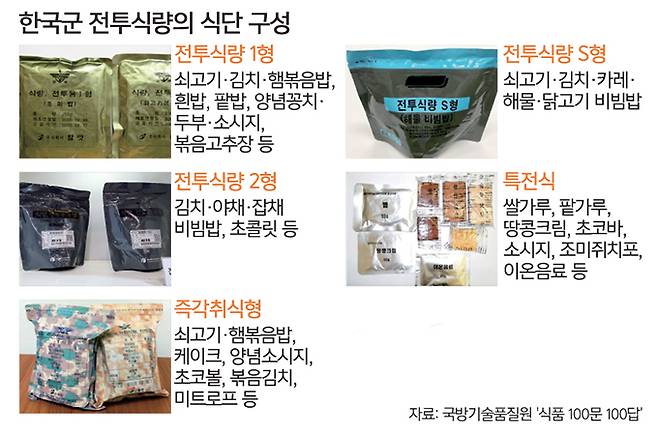 우리나라는 주식인 밥과 장기 저장이 가능한 김치나 젓갈 등이 들어간 반찬을 함께 먹는다. 전투식량도 이를 반영해 밥과 반찬 위주로 16개 식단을 운용한다. 과거에는 미군 전투식량에 건빵과 통조림, 고추장볶음 등을 추가한 수준이었지만 1980년대 들어 “한국군에 적합한 전투식량이 필요하다”는 목소리가 높아지면서 맛과 편리성을 겸비한 한국형 전투식량(1형, 2형, S형, 즉각취식형, 특전식)이 보급되고 있다. 1형은 뜨거운 물에 데워 먹으며, 2형과 S형은 개봉 후 뜨거운 물을 부어 취식한다. 즉각취식형은 발열끈을 잡아당기면 내장된 발열체가 가열돼 전투식량을 데운다. 특전식은 개봉 즉시 식사가 가능하다.