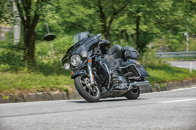울트라 리미티드에 장착된 1868cc의 밀워키-에이트 엔진은 트윈-쿨드 시스템이 적용 된다. 이름처럼 공랭과 수랭의 두 가지 냉각방식을 결합한 것이다. 기존의 공랭엔진의 구조와 감성적인 필링을 유지하면서도 엔진 헤드둘레만 수랭으로 식혀주는 것으로 열관리에 유리해서 성능저하가 일어나지 않는다. 라디에이터는 레그쉴드 좌우에 나누어 숨겨놓았다. 외형이 이전과 크게 달라지지 않고 디자인적으로도 못생긴 라디에이터를 감춘 것은 그야말로 신의 한수다. 엔진은 6기통의 경쟁자들과 비교하면 다소 소박한 느낌을 주는 2기통의 V트윈 엔진이지만 현재 투어링 라인업에 적용된 엔진은 피스톤의 진동을 상쇄시켜주는 카운터 밸런서와 엔진과 프레임의 연결을 고무재질로 해서 진동을 걸러주는 러버 마운트를 동시에 적용했다. 덕분에 엔진 자체의 고동감은 전달되지만 불쾌한 진동을 거의 남기지 않는다. 물론 아무리 그렇다 한들 관점과 기준에 따라 풍부한 토크와 매끄러운 가속, 감미로운 사운드를 제공한다고도 할 수 있고 출력이 낮고 거칠고, 시끄럽다고 할 수 있다. 내 경우는 후자보다는 전자에 공감 할 뿐이다.재미의 포인트가 다르다 세 바이크 모두 두 바퀴의 매력을 듬뿍 담은 모터사이클임에는 틀림이 없지만 타고 있을 때 모터사이클의 느낌을 가장 진하게 느낄 수 있는 것은 역시 할리였다. 주행하는 감각부터 엔진의 필링이나 변속 느낌 등 기계적인 매력이 듬뿍 담겨있다. 시소 기어를 뒤꿈치로 쿡쿡 밟아가며 변속하는 손맛, 아니 발맛이 살아있다. 저회전부터 굵고 두툼하게 터지는 토크를 이용해 마치 북을 두드리듯한 필링으로 가속하는 것은 빅트윈 엔진만의 매력이다. 재빠르게 변속을 마치는 퀵시프트나 오토매틱 미션인 DCT와는 좋고 나쁨을 떠나 추구하는 재미의 결이 완전히 다르다. 특히 바이크의 중심 뒤에 앉아가는 느낌이 드는 두 모델과 달리 울트라는 운전자가 바이크의 중심에 앉아서 달리는 느낌이 좋았다. 게다가 린 앵글 한계가 금방 와서 바이크를 많이 기울일 수 없어서 그렇지 핸들링의 안정감과 민첩함은 뒤지지 않는다. 물론 고갯길에서 페이스를 올리려고 하면 마치 라이더를 말리기라도 하듯 긁는 소리를 내는 것은 조금 아쉬웠다. 만약 장거리를 함께 빠르게 달린다면 울트라는 그다지 재미가 없을지도 모르겠다. 하지만 한적한 국도를 여유롭게달리며 사랑하는 사람과 두런두런 이야기도 나누면서 경치구경도 하는 여행을 생각하면 울트라만큼 어울리는 것이 없다. 셋 중 유일하게 우리나라 국도의 속도 제한인 80km/h안에서도 충분한 재미를 느낄 수 있는 모델이 아닐까 싶다.