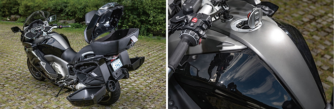 윤 : K 1600 GTL의 박스는 탑 케이스와 사이드 케이스 모두 풀페이스가 여유롭게 들어간다. 사진만 봐도 그 크기가 엄청나다. 뒤가 그렇게 큰데도 핸들링이 좋다는 게 대단하다. 센트럴 락 기능도 편리하고. 센트럴 락 기능이 없으면 일일이 잠그고 열고 번거롭다.