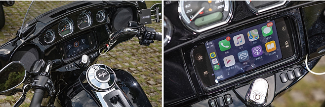 그렇게 오랜 시간동안 크게 변하지 않고 고전적인 스타일을 고수하는 할리데이비슨 이다보니 기술적으로 뒤쳐진 모델이라고 생각 할 수도 있다. 하지만 최신 할리데이비슨에는 의외로 많은 첨단 전자장비가 들어간다. 특히 2020년 모델부터 적용된 RDRS(리플렉스 디펜시브 라이더 시스템)은 관성측정장치(IMU)기반으로 기울기를 감지하는 트랙션 컨트롤과 ABS는 물론 엔진브레이크가 과도한토크를 발생시켜 미끄러지지 않도록 하는 드래그 토크 슬립 컨트롤도 적용된다. 여기에 언덕 밀림방지까지 준비되고 브레이크가 전후 연동으로 작동하는 것은 물론이다. 물론 대부분이 경쟁 모델들도 갖추고 있는 기능들이지만 할리데이비슨에도 그대로 적용된다는 것은 살짝 놀라운 부분. 시대의 흐름에 뒤처지지 않도록 이러한 기능들을 꾸준히 업데이트하고 있다. 그런데 이러한 기능들은 겉으로는 전혀 드러나지 않고 묵묵히 뒤에서 라이더를 보조하는 역할만할 뿐이다. 할리데이비슨은 ABS를 위한 휠스피드 센서 마저도 디자인을 해친다는 이유로 숨기는 브랜드다. 하지만 경쟁자들과 비교해서 확연히 드러나는 첨단기능도 있다. 다름 아닌 인포테인먼트 시스템이다. 대형 터치스크린을 내장하고 끝내주는 출력의 오디오시스템이 기본으로 장착되며 애플 카플레이와 안드로이도 오토를 지원한다. 중앙의 TFT화면에 카카오 내비가 자연스럽게 출력되어 깜짝 놀랐다.
