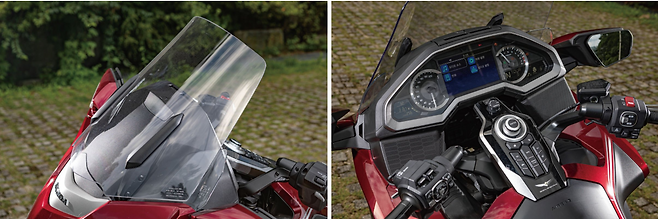 육중한 무게를 내 마음대로 다룬다. 코너의 입구부터 뱅킹각도를 원하는 만큼 줄 수 있다. 어느 한 부분 땅에 일찍 닿지 않는다. 그런데도 타이어 그립의 한계는 아직 여유가 있어 보인다. 코너링 스피드가 빠르기 때문에 코너의 정점을 지나며 모터사이클과 함께 날아가듯 탈출한다. 큰 덩치에도 연속적인 코너에서 허둥대지 않는다. 코너를 타다보면 점점 자신감이 충만해진다. 뱅크의 끝을 경험해보고 싶은 욕심이 절로난다. 하지만 어느 순간 사색이 된 텐덤 라이더 얼굴을 떠올리며 정신을 차린다. 제동 감각은 묵직하게, 끝까지 원하는 만큼 유지된다. 기본 세팅은 급제동할 때 순간적으로 앞 쇼크업소버에 모든 무게가 전해지지 않도록, 부드럽게 세팅된다. 앞으로 꽂히는 감각이 아니라 차분하고 묵직하게 가라않는 다는 설명이 정확하다. 클러치 레버는 가볍다. 클러치 미트 포인트 유격이 많아서 다루기도 쉽다. 업/다운 시프트를 모두 지원하는 퀵 시프트 변속기는 고급스러운 감각의 정점이었다. 특히 스로틀이 줄어든 상태에서 다운 시프트를 명령할때 더블 클러치 동작을 자연스럽게 실현하며 울컥거림 없이 부드럽게 기어를 낮췄다. 전동 윈드 실드는 버튼으로 속도를 조절할 수 있다. 주행 속도나 환경에 맞춰 미세하게 각도를 조절할 수 있다. 커다란 윈드 실드를 완전히 세우면 주행 풍은 거의 맞지 않는다. 하지만 이런 상태가 꼭 답은 아니다. 주행 풍을 방패처럼 막으면서 양옆으로 들이치는 와류가 라이더와 텐덤 라이더를 때리며 괴롭힌다. 장거리 주행 중에 비가 내리는 구간을 지날 때였다. 윈드 실드를 가장 높게 들고 방패처럼 뒤에 숨어갈 생각이었다. 생각이 짧았다. 비가 윈드 실드에 맺히면서 앞이 잘 보이지 않았다. 당황해서 윈드 실드 각도를 아래로 내렸다. 그러자 앞머리에 맺힌 물방울이 윈드 실드 끝에서 덩어리로 뭉쳐져서 운전자에게 와르르 쏟아졌다.