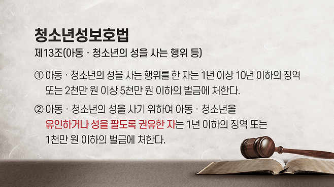 반면 성매매 대상이 만 19세 미만의 아동·청소년일 경우는 얘기가 달라집니다. 청소년성보호법은 미성년자가 성을 팔도록 유인하거나 권유한 행위뿐 아니라, 이 행위가 미수에 그치더라도 처벌하게 돼 있습니다.