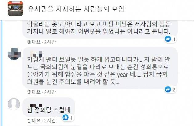 유시민을 지지하는 사람들의 모임에서는 한 네티즌이 "저렇게 속옷 보일 듯 말 듯 입고 다니다가 마음에 안 드는 국회의원이 눈길을 다리로 보내는 순간 성희롱으로 몰아가기 위해 함정을 판 것"이라고 했다
