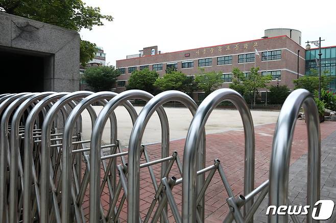 (서울=뉴스1) 이승배 기자 = 1일 오후 서울 중랑구 중목초등학교 교문이 코로나19 확진자 발생으로 폐쇄조치 돼 닫혀있다..