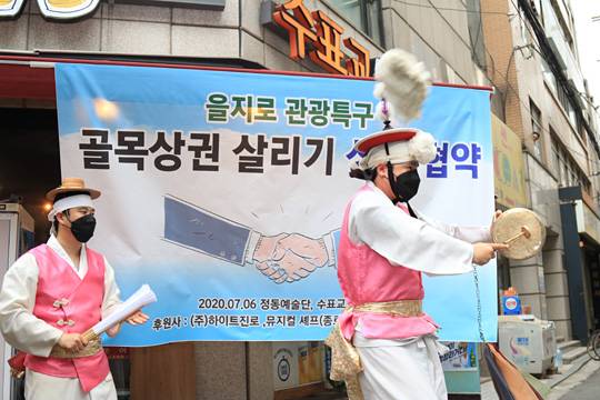 서울 중구 을지로3가 '관광특구'인 수표교 일대 상인들이 코로나19로 인해 위축된 상권 활성화를 도모하고 전통공연예술단, 뮤지컬 공연단과의 상생협력을 통한 골목상권 살리기에 적극 나섰다.
