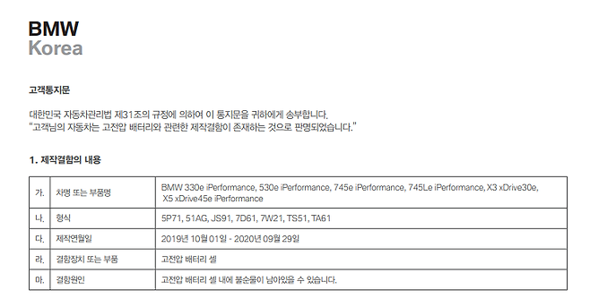 BMW코리아는 지난 주 330e iPerformance, 530e iPerformance, 745e iPerformance, 745Le iPerformance, X3 xDrive30e, X5 xDrive45e iPerformance 등 6개 차종 소유자들에게 화재 위험성에 따른 시정조치에 들어간다는 내용의 통지문을 보냈다. 대상 차량은 지난해 10월부터 올해 9월까지 제작, 판매된 차량이다.