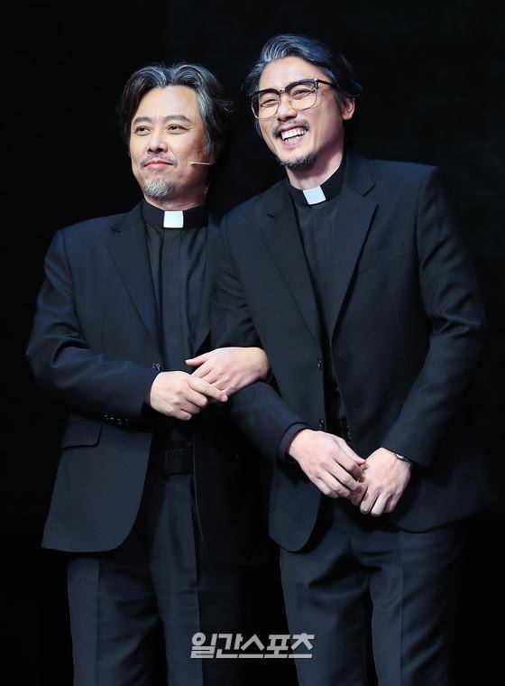 배우 서현철, 이동준이 13일 오후 서울 종로구 연건동 홍익대학교 대학로 아트센터 대극장에서 열린 뮤지컬 ‘광주’ 프레스콜에 참석해 포토타임을 갖고 있다.