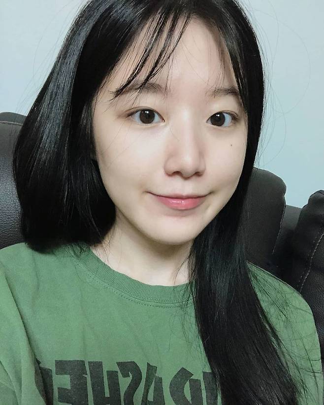 사진 속 슈화는 민낯과 함께 수수하게 녹색 티를 입었다.