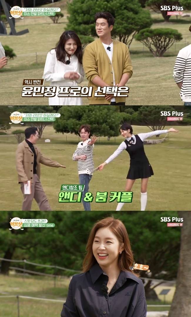 오스틴강, 앤디, 서태훈, 송병철, 이지혜 프로, 이송정 프로, 윤민정 프로는 각자 자신만의 개인기로 매력을 발산했다. 윤민정 프로는 송병철을 선택했다. 이소정 프로는 서태훈을 선택했다. 이지혜 프로는 오스틴강을 선택했다. 선택을 받지 못한 앤디는 MC 붐과 한팀을 이뤘다. (사진=SBS PLUS ‘러브샷’ 캡처)