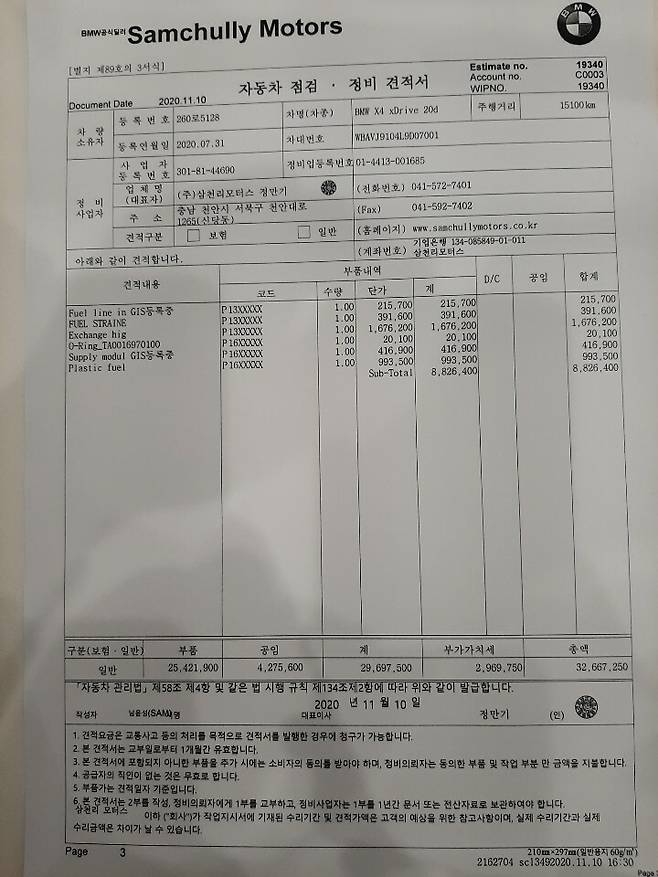 더불어 정 씨는 BMW의 가짜 경유 대처 방식과 과다 수리 비용에도 문제를 제기했다. BMW AS센터가 요구한 수리비 3260만 원이 과도하다는 것이다.