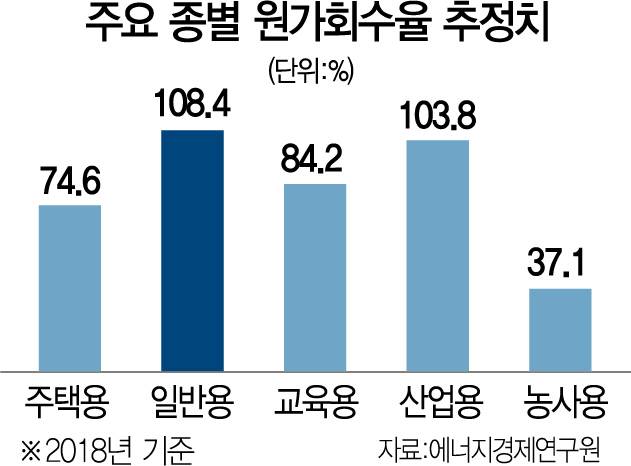 한전은 용도별 요금 체계가 굳어지면서 요금과 공급 비용의 간극이 지나치게 커졌다고 보고 있다. 에너지경제연구원에 따르면 2018년 기준 농사용 전기 요금의 원가 회수율은 37.1%로 추정된다. 주택용과 교육용의 회수율 역시 각각 74.6%, 84.2%로 원가에 한참 못 미친다. 사정이 이렇다 보니 원가 이상을 내는 산업용과 일반용 전기 요금으로 곳간을 메우고 있다. 동일한 곳에 동일한 전력을 공급하면서도 원가가 배 이상 차이 나는 것은 공정성에 어긋난다는 지적도 있다. 정연제 에너지경제연구원 연구위원은 “물가 안정, 신사업 활성화, 사회적 약자 지원 등 정책 목적 달성을 위해 정치가 과도하게 전기 요금 체계에 개입해 (전기 요금의) 일관성과 예측 가능성, 투명성 원칙을 훼손하고 있다”고 꼬집었다.