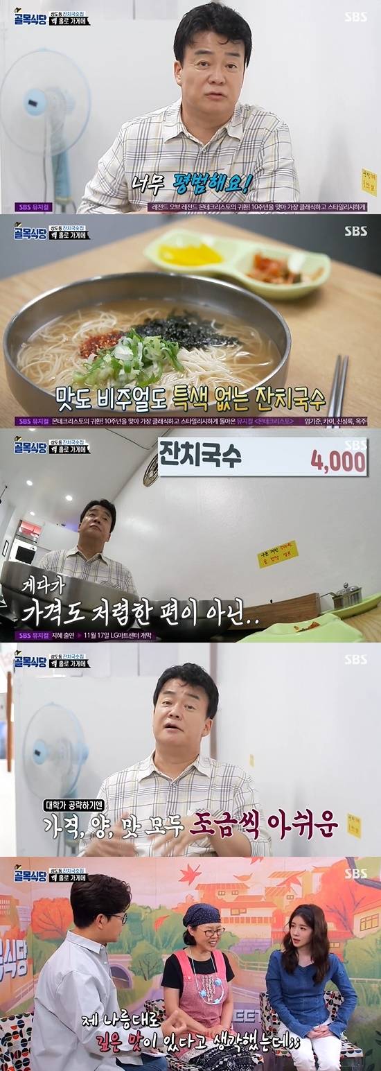 사장님이 쓰는 액기스를 본 백종원은 "시판 액기스 쓰면서 조미료 안 넣는다고 한 거냐. 여기에 조미료 다 들어간 거다"라고 지적했다. 주방 정리는 양호한 편이라고. 사장님은 "잔치국수, 비빔국수, 쫄면 세 가지만 했으면 좋겠다"란 바람을 전했다.