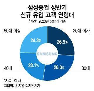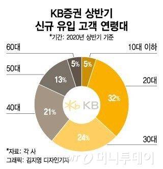 특히 이중 20~30대 차지하는 비중은 상당하다. 삼성증권에 따르면 올해 상반기 신규 유입 고객 가운데 20~30대 비중은 합산 52.5%를 차지했다. 특히 20대 신규 투자자의 비중은 26.0%로, 과거 2년 평균 비중(22.9%)에 비해 늘었다. KB증권 또한 상반기 신규 계좌 개설 고객의 56%가 20~30대였다.