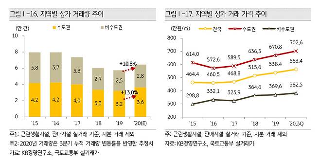 27일 KB경영연구소의 ‘2021 부동산보고서’에 따르면 올해 상업용 부동산(오피스·상가 등) 시장 매매거래는 전년 비 13.1% 늘어난 8만4000건으로 집계됐다. 단위면적당 평균 거래가격도 3분기 기준, 전년 말 대비 4.7%가 올랐다.