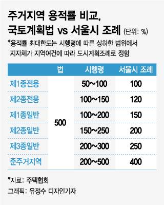 시행령은 이들 범위 내에서 특별시·광역시·특별자치도·시 또는 군의 도시·군 계획 조례가 정하는 비율을 초과할 수 없다고 규정하고 있다. 서울시의 경우, 서울시 도시계획 조례에서 정하는 용적률이 최종 상한인 셈이다.