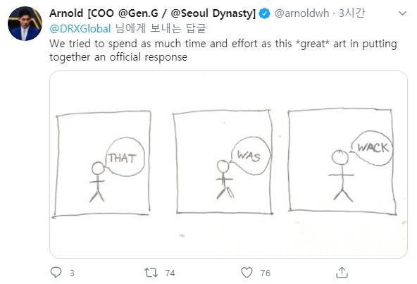 젠지 이스포츠의 아놀드 허 COO는 좀 더 직접적인 반응을 보였다. 아놀드 허 COO는 27일 DRX의 게시글에 "We tried to spend as much time and effort as this *great* art in putting together an official response(우리는 공식적인 답변을 위해 이 *훌륭한* 예술 작품 만큼 많은 시간과 노력을 기울였다)"는 글과 함께 한 장의 그림을 게재했다.