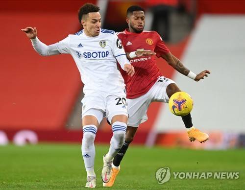 epa08896266 Leeds' Rodrigo (L) in action against Manchester United's Fred (R) during the English Premier League soccer match between Manchester United and Leeds United in Manchester, Britain, 20 December 2020. EPA/Michael Regan / POOL EDITORIAL USE ONLY. No use with unauthorized audio, video, data, fixture lists, club/league logos or 'live' services. Online in-match use limited to 120 images, no video emulation. No use in betting, games or single club/league/player publications.